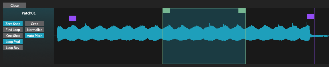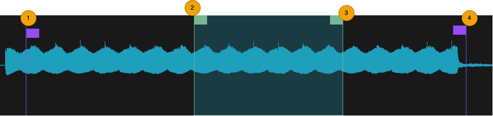 The vertical purple lines displayed over the waveform indicate playback start and end points. Drag handle right or left to trim unwanted audio playback from the start or the end of the sound. The green section shows the looped portion of the audio, when Loop Fwd or Loop Rev is enabled.