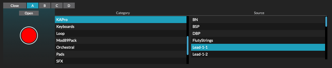 Source A/B/C/D: Click or tap the Source name to show the “sources_editor”. A new sound source may be loaded into the selected slot, an existing sound may be edited, or a new sound created (sampled).